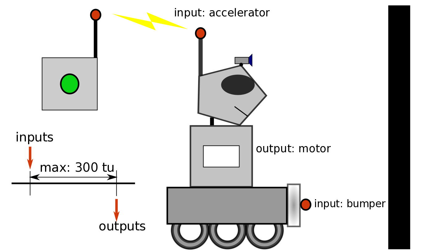 Very often, the specification for the system under development encompasses a limit on how long it may take the system to read its inputs and compute and feedback its outputs. Imagine for example a simple robot that drives as long as the accelerator button of the remote control is pressed. Assume that the robot has a bumper sensor input, which represents the detection of contact with an obstacle. Assume that as soon as such a contact happens, the robot has to stop in 300 time units (let's stay abstract as to the representation of time at the moment), because otherwise its crushing zone will be consumed and serious damage might occur. Driving and stopping are represented by the boolean "motor" output, which is set to true, when the robot is to drive and false when it must stop. Additionally, our the robot can write different log files and take images with its camera. For those functionalities the modeler may refer to host code library functions errorLog(), writeLog() and getImage().