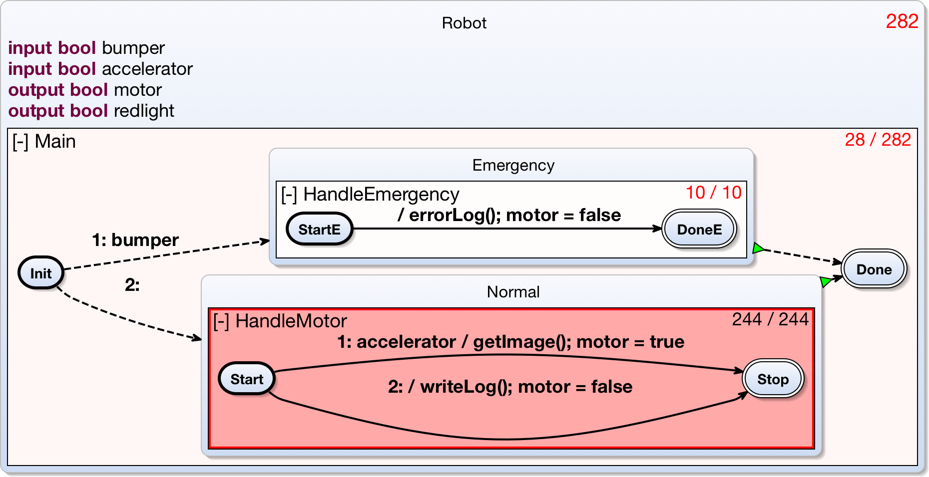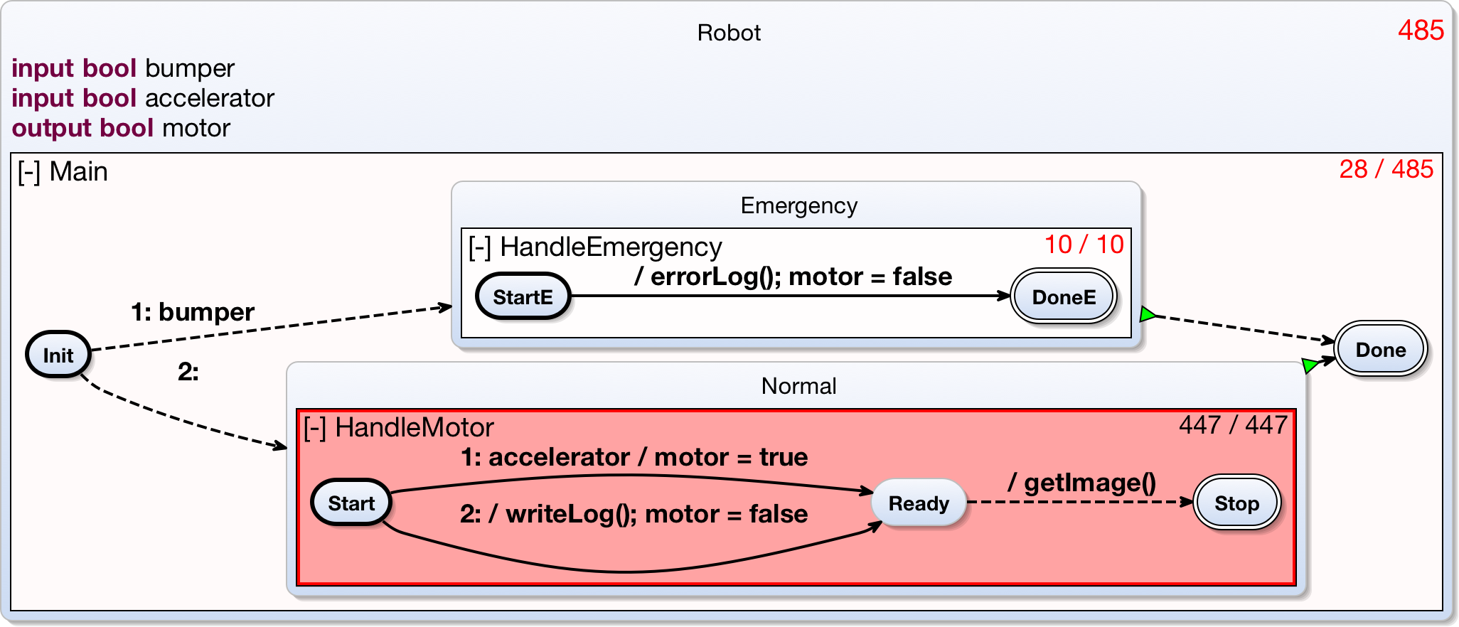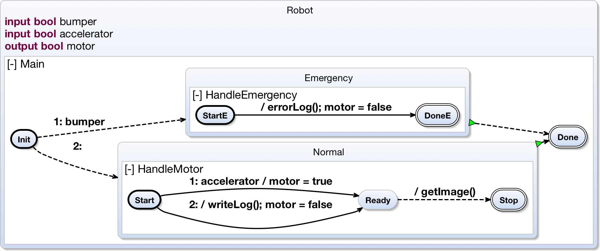 There are three regions, called Main, HandleEmergency and HandleMotor. Depending on whether the bumper sensor input is true or not, we enter one of the two inner regions. In the case the bumper sensor was activated, the HandleEmergency region will be executed, in the other case HandleMotor is active. In the collision case, the robot writes an error log file, which is represented by a host code call to errorLog(). Also the motor output is set to false. In the other case the robot drives, given its accelerator button is pressed, which is represented by the accelerator input and then it takes a picture.